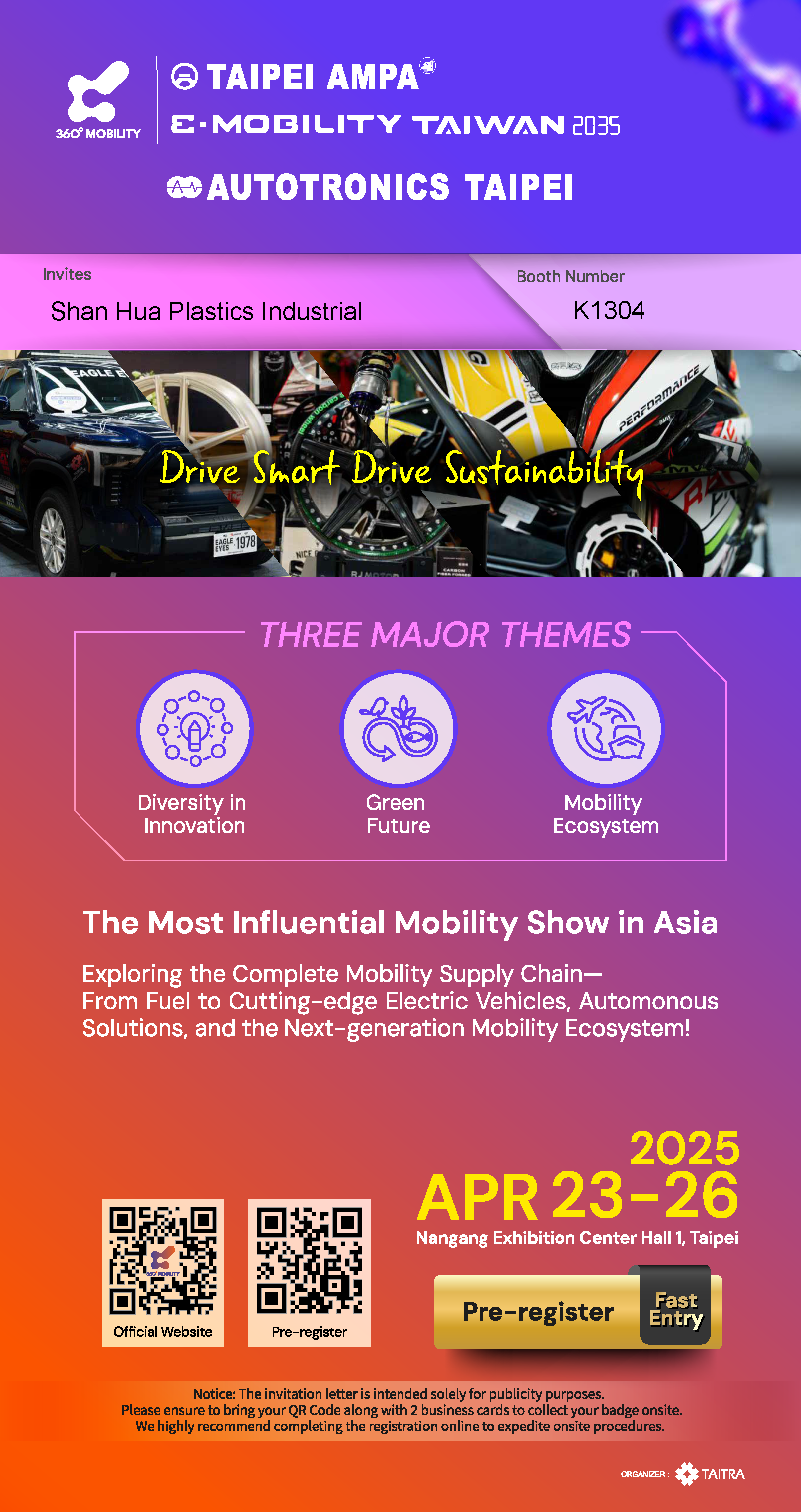 SHPI will showcase PRO air tubing products for automotive applications at the 2025 Taipei AMPA, including PU, PA, PE tubes and matching fittings.
